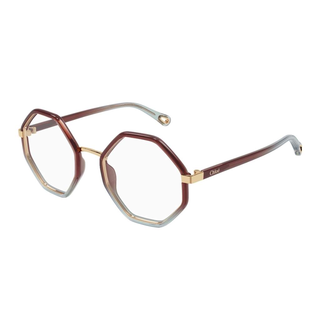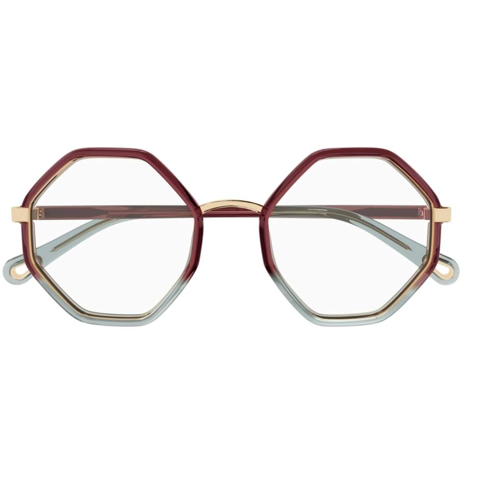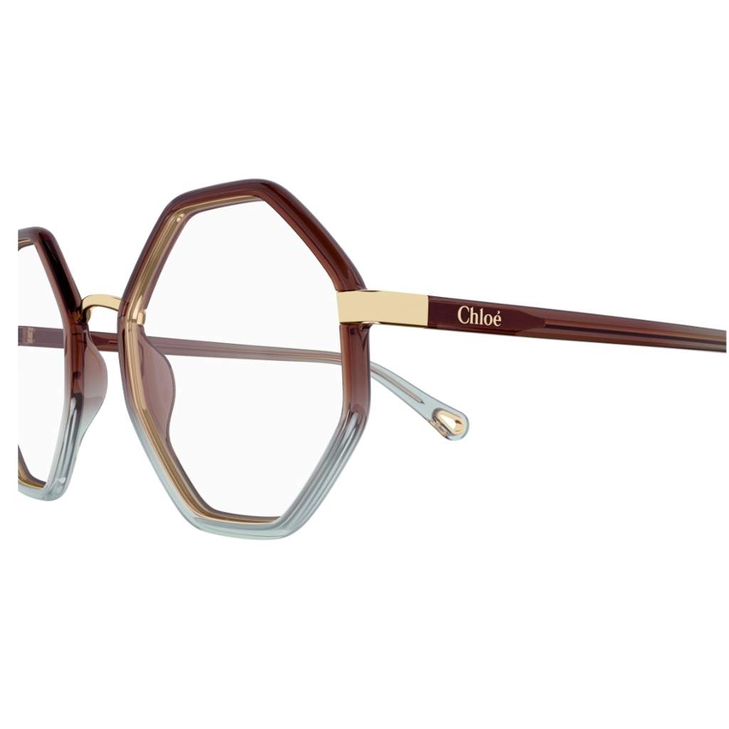 CHLOE’ CH0132O Iconica montatura esagonale con cerchi arcobaleno bio iniettati e aste in bio-acetato sfumato. Ponte in metallo e griffe in metallo dorato che collegano i cerchi alle aste, logo stampato a caldo sull’asta sinistra. Iconica apertura a goccia sui terminali, decorata con logo inciso.