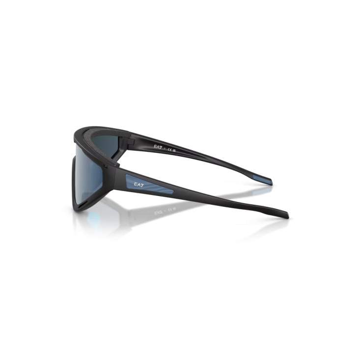 Emporio Armani Q74001 mascherina avvolgente slim fit disponibile in nero satinato lente blu a specchio.
