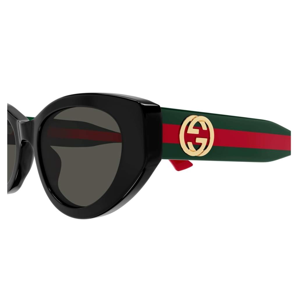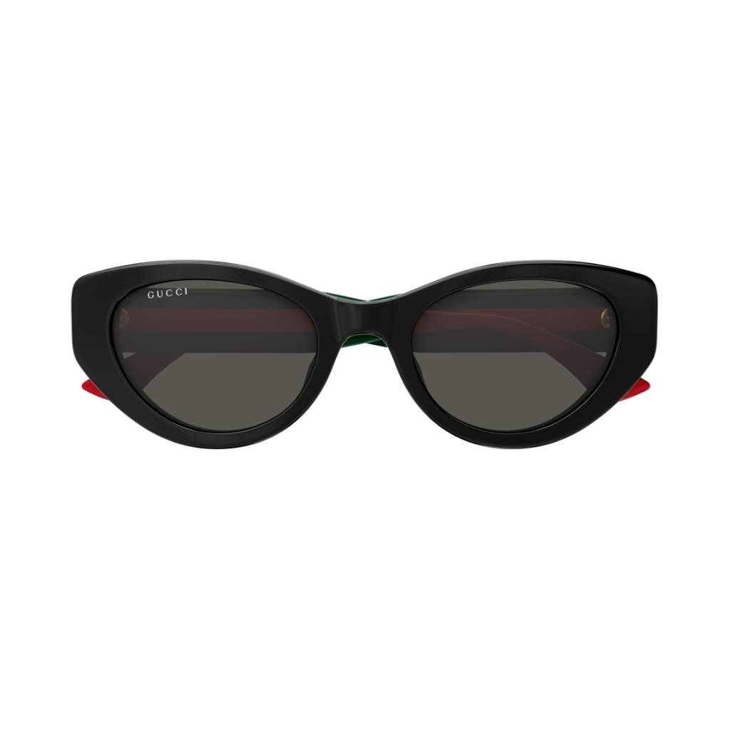 Gucci GG1862s Forma commerciale con dettaglio web su asta media. Forma stretta a occhio di gatto. Il nuovo logo lettering di Sabato De Sarno è estremamente visibile nella vista laterale in oro. Aste web istituzionali Verde-Rosso-Verde e Blu-Rosso-Blu.
