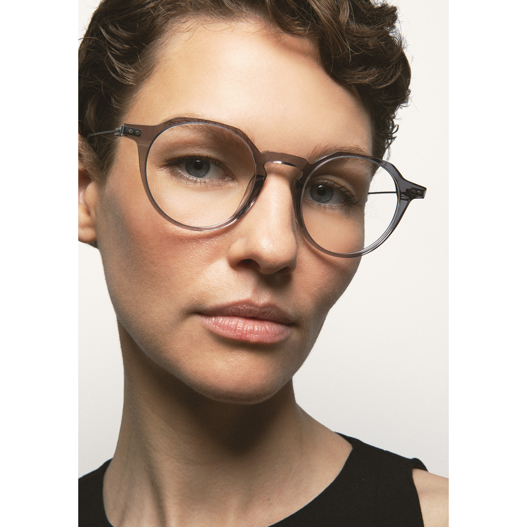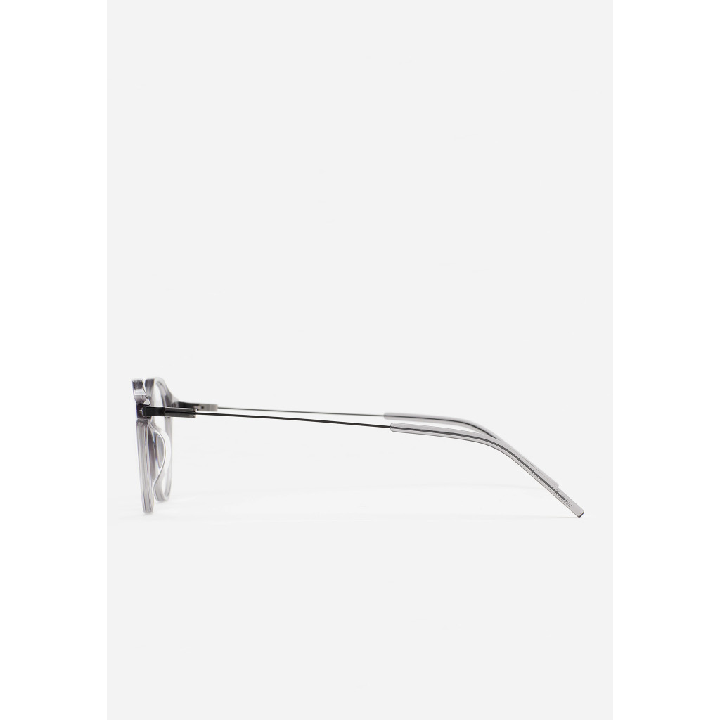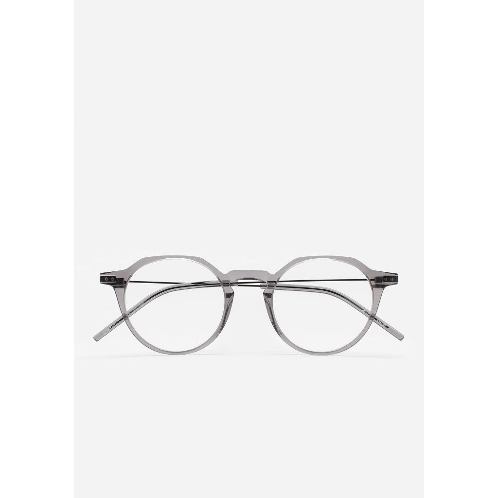 KALEOS VISTA Gubbins Occhiali da vista Pantos con sopracciglio piatto e ponte a chiave. Frontale in acetato high density grigio trasparente. Aste in acciaio inox nero opaco con terminale in acetato grigio trasparente. Aste con la nuova cerniera senza viti. Piastrine in acetato integrate. Realizzati a mano.