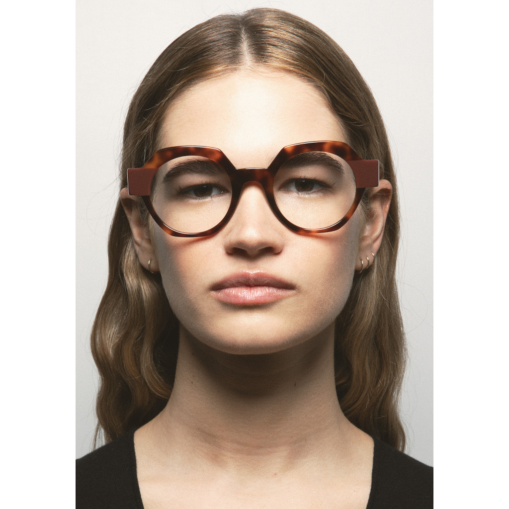 KALEOS VISTA Guerrero 5 Occhiali da vista a forma rotonda con sopracciglio piatto. Frontale in acetato havana marrone con laminato marrone. Aste in acetato havana marrone. Piastrine in acetato integrate. Realizzati a mano.