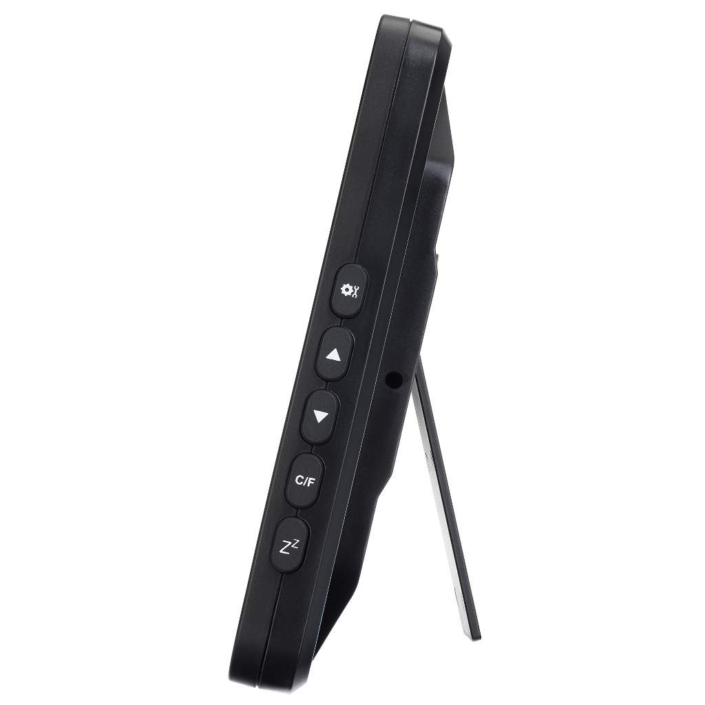Un altro pregio di Levenhuk Wezzer Tick H80 sono le cifre di grandi dimensioni per mostrare l’ora, che occupano quasi l’intero schermo. Grazie alla loro grandezza, sono facilmente visibili anche a distanza. Le informazioni aggiuntive sono mostrate con un carattere più piccolo. Grazie all’elevato contrasto, leggere i dati a schermo non è mai un problema. Sono mostrati temperatura, umidità, giorno della settimana e data. In aggiunta, sullo schermo possono apparire due icone: quella della sveglia e quella della funzione posponi (snooze). I pulsanti di controllo sono posizionati sul pannello destro e possono essere raggiunti facilmente, senza nemmeno guardare.