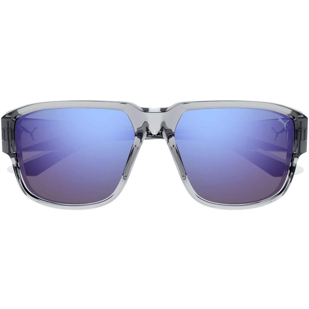 Puma PU0445S con audaci aste decorate con tripla linea incisa che richiamano la “riga Puma”. Montatura sportiva dalla forma rettangolare. Modello interamente iniettato.